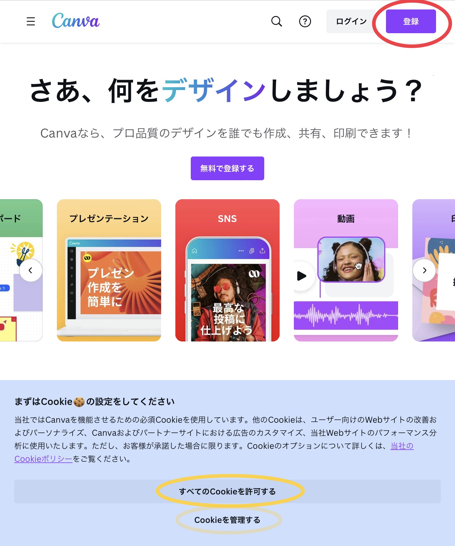 では、Canvaに新規登録しましょう。