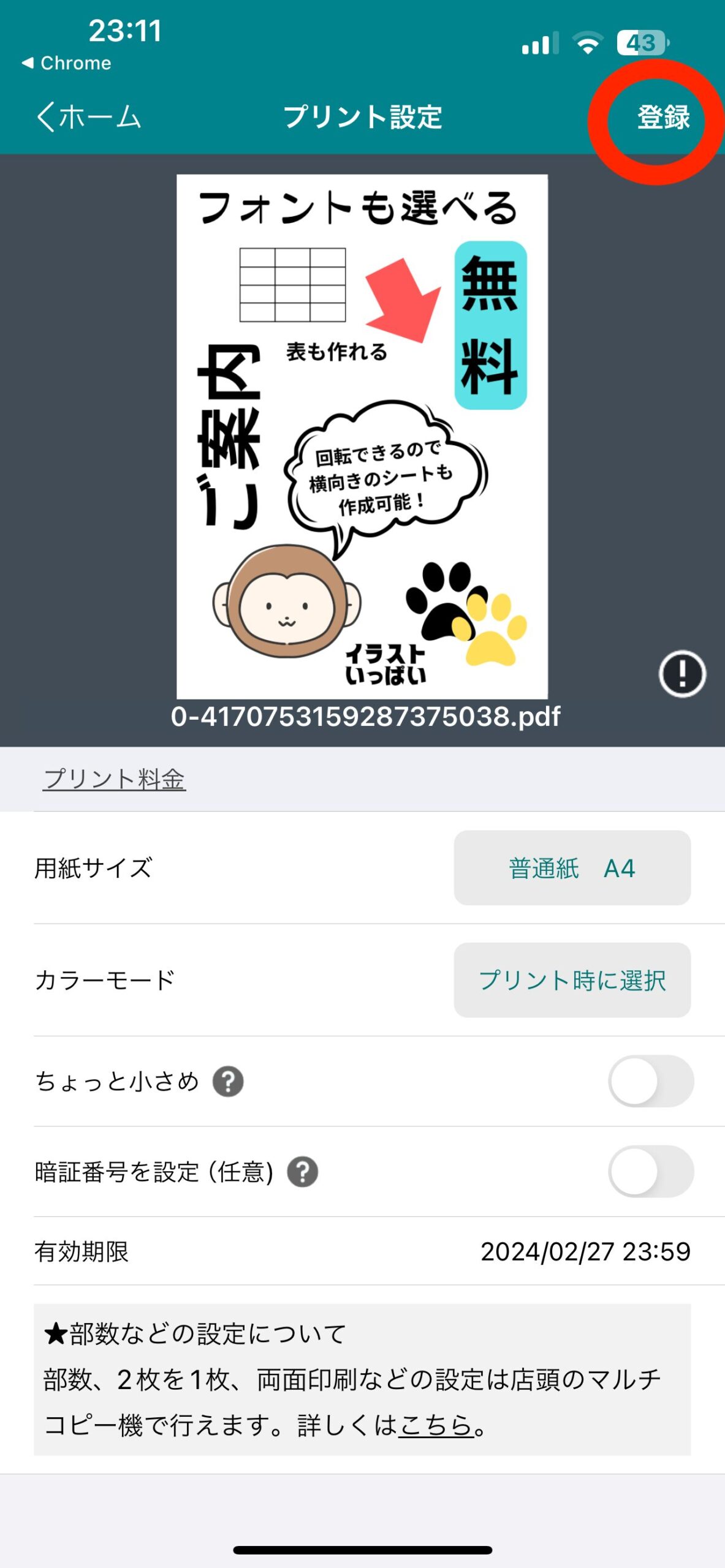 →プリント設定画面になりました→『印刷サイズ』『カラーモード』設定できますが、後ほどコンビニのコピー機でも設定できます→【登録】→【アップロード完了】→【閉じる】