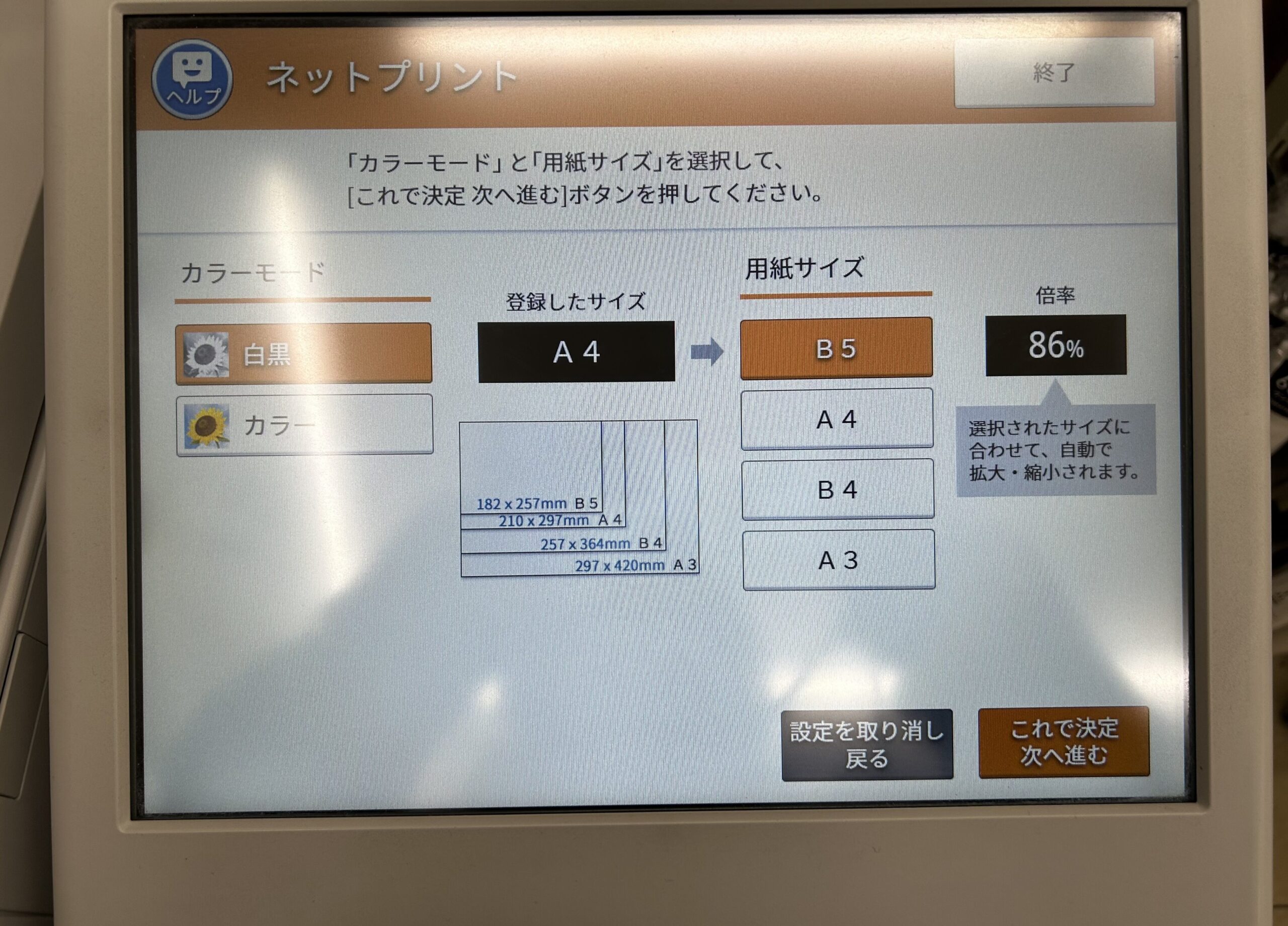 ここで、【カラー】or【白黒】・用紙サイズをえらびます。