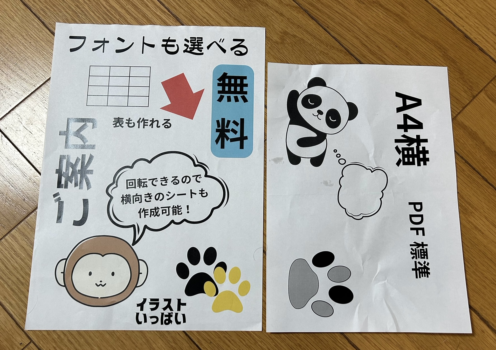 白紙のA4のシートに、文字やイラストを挿入する感覚でレイアウトがわかりやすく、用紙からはみ出す心配もありません。下の画像は【A4】サイズで作成しました
