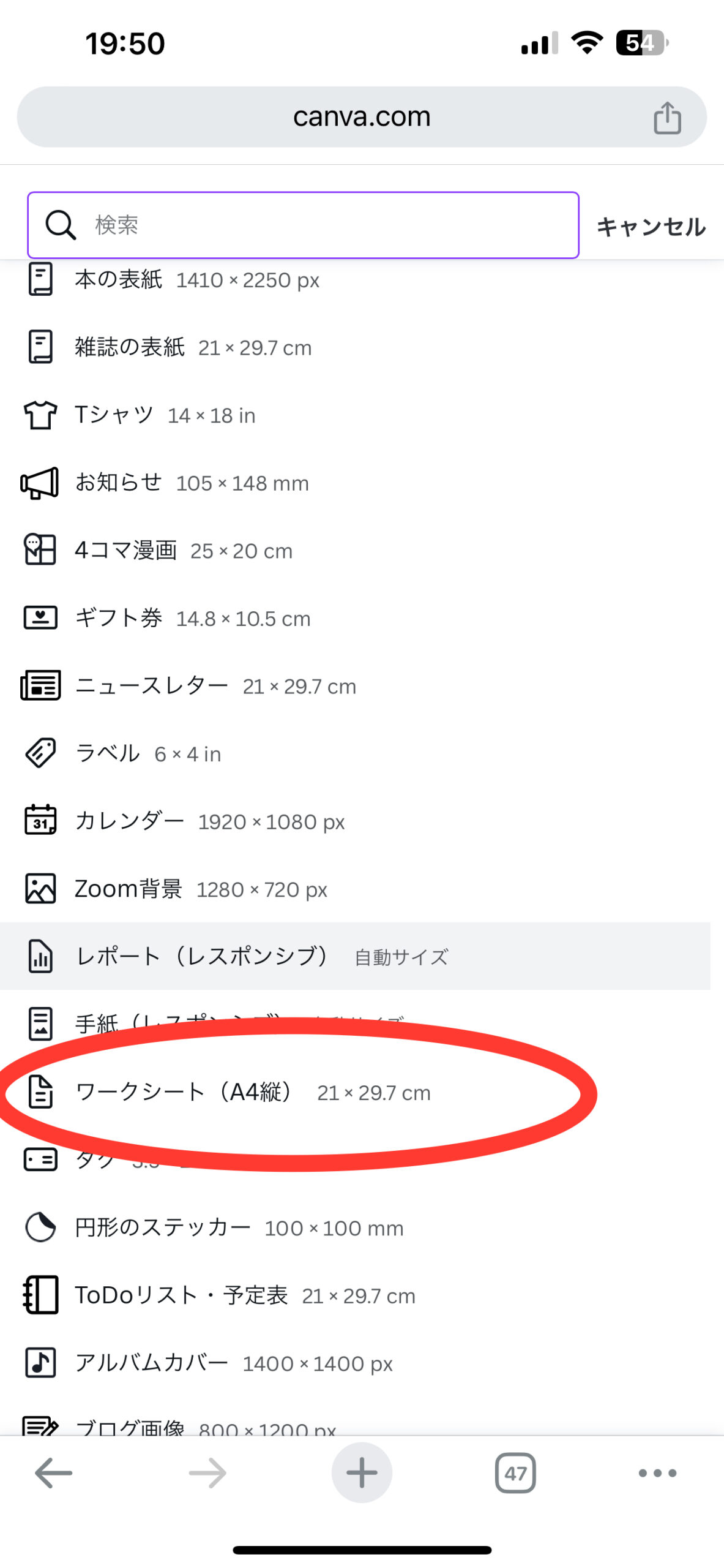 ②【Canva】で「ワークシートA4」を選択→文書作成→PDFでダウンロード
