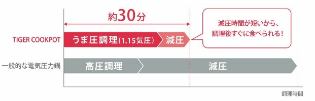うま圧調理は一定圧力をかけて調理を行なった後は約7分で減圧を完了。