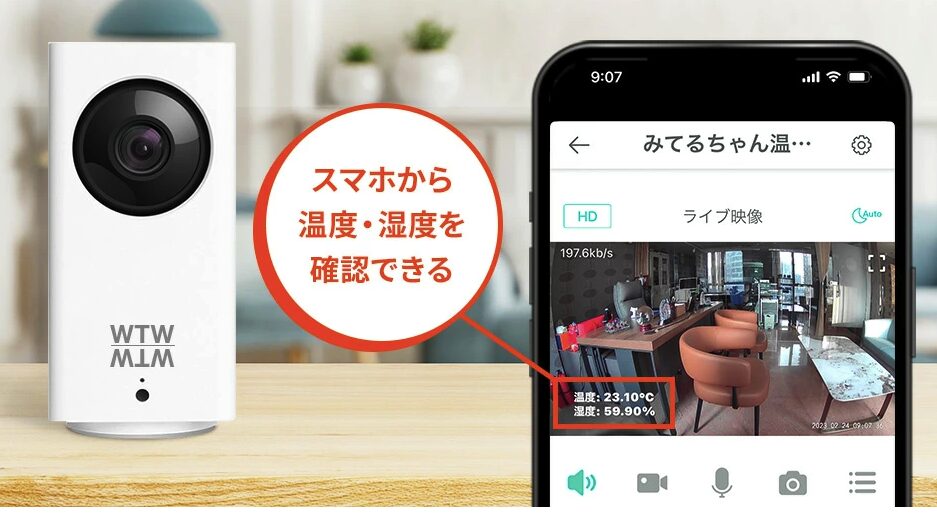 温度・湿度センサーを搭載しているので部屋の温度・湿度をいつでも計測することが出来ます。スマートフォンアプリから確認することができるのでお子様やペットの安全を見守ることができます。