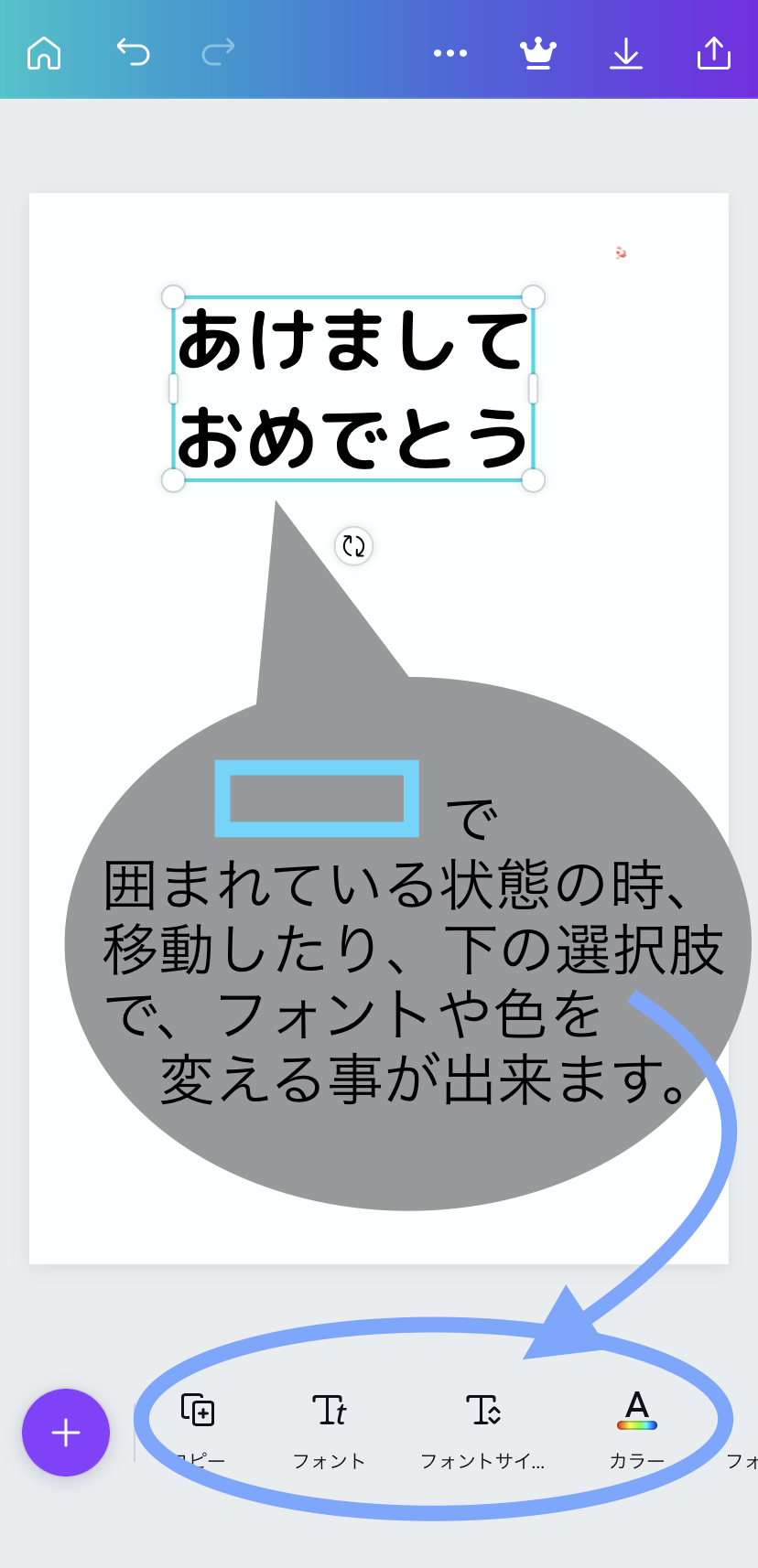 - 他の場所をタップしてもう一度文をタップすると文字が移動できるようになります。