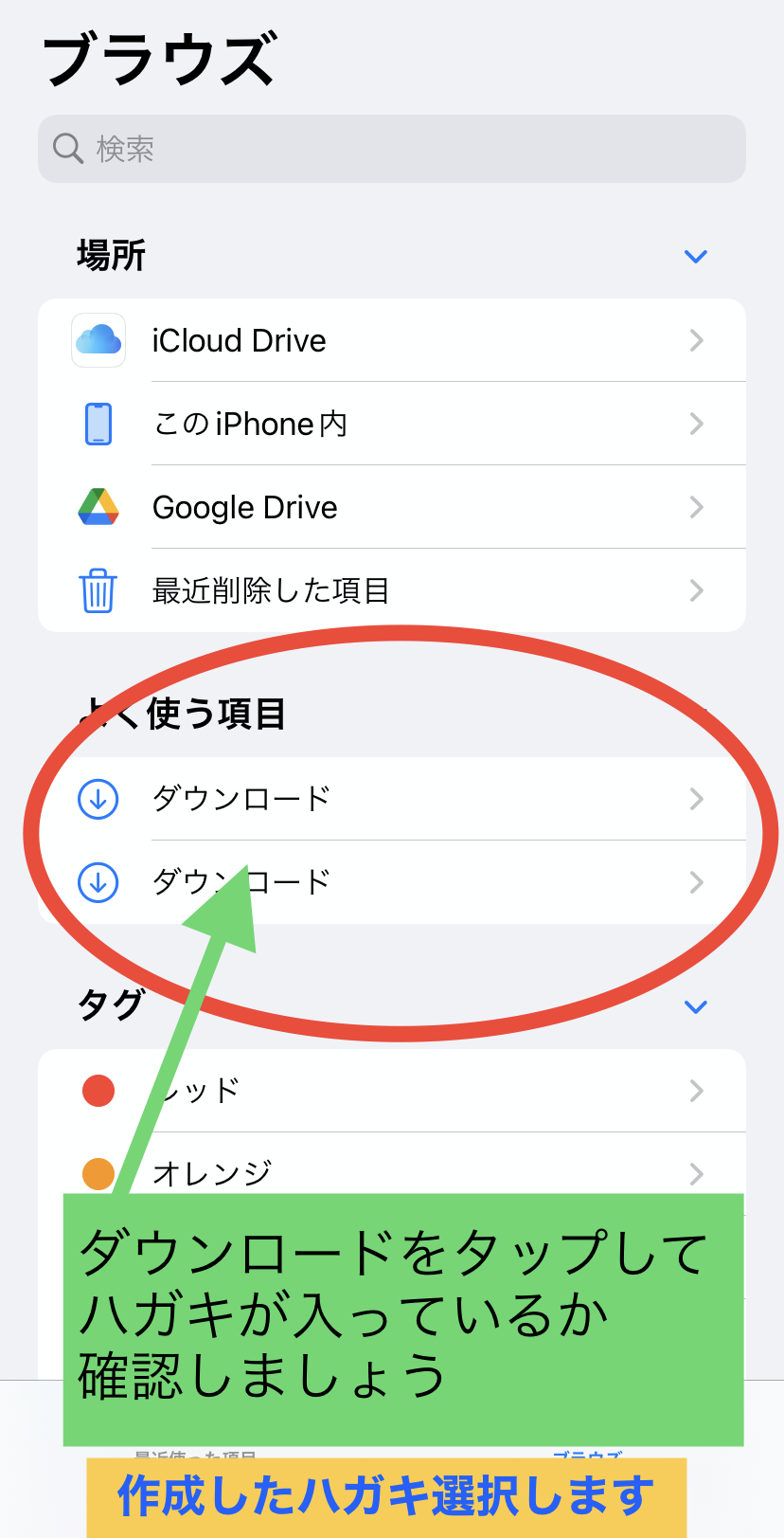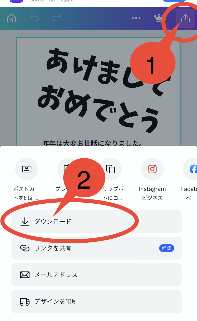 ❻ダウンロードをタップして、作成したハガキを選択します。