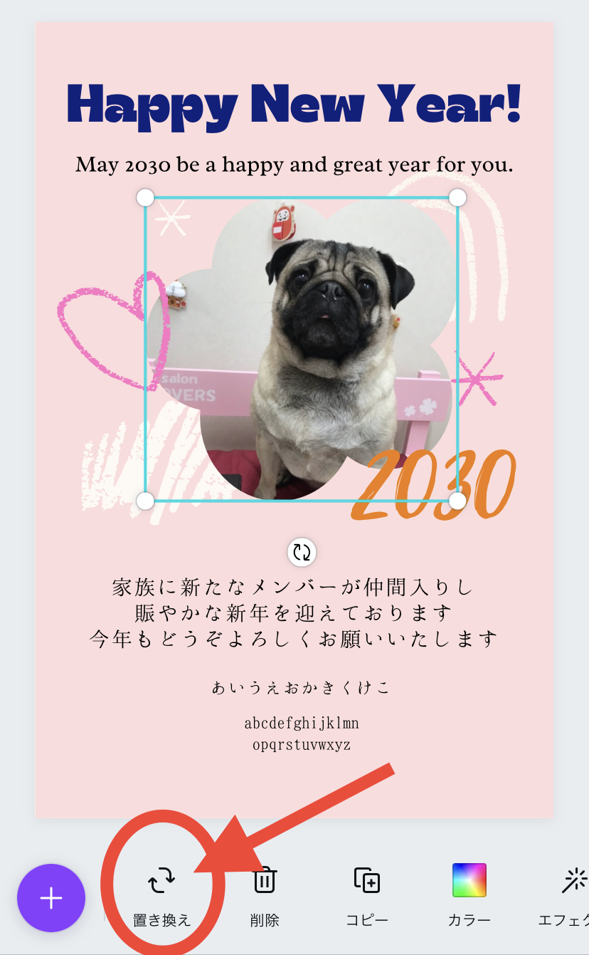写真を入れる場合は、元の写真をタップして、【置き換え】をタップ