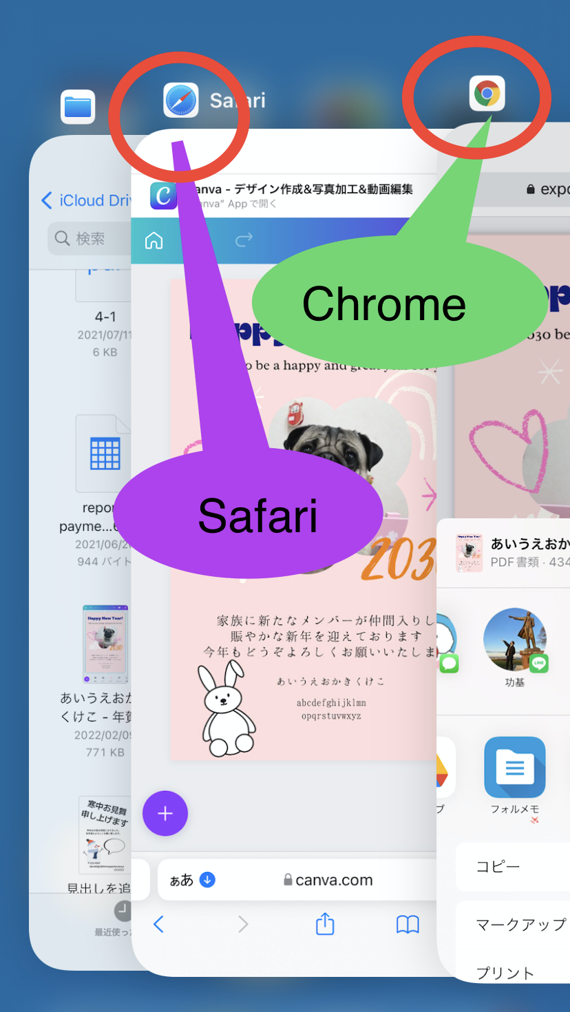 どのブラウザを使っているかわからない方は、マルチタスク画面を表示させましょう。