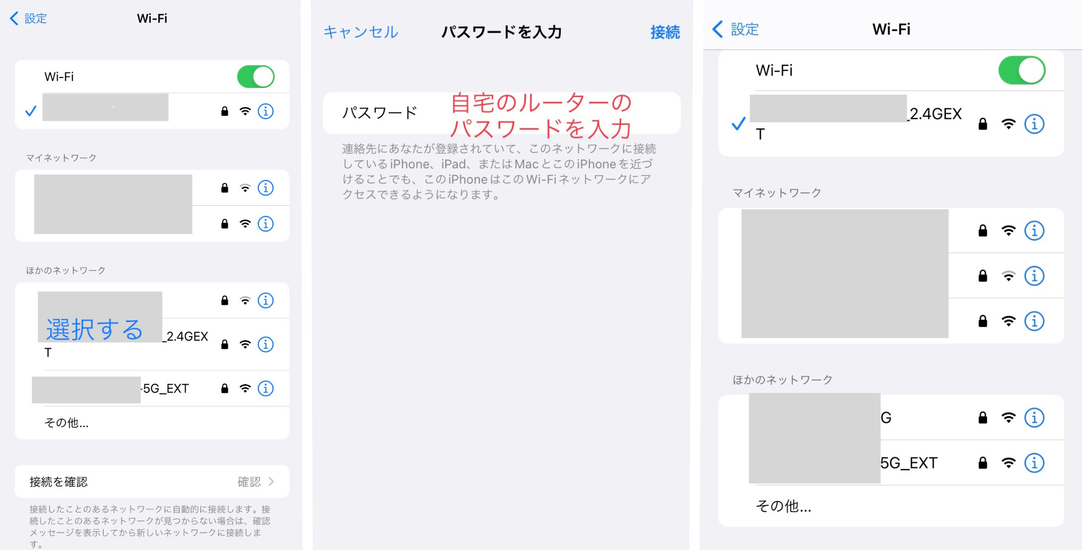 4. スマホの設定のWifi名の中に、自宅のWifiルーターの名前(SSID)の後ろにEXTとついたWIFI名を選択します。パスワードが要求されるので、ルーターのパスワードを入力します。(自宅ルーターの側面などに記載されている)